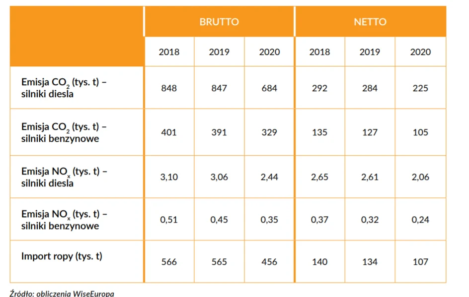W poniższej tabeli znajdują się emisje według wyliczeń ekspertów WiseEuropa. Wielkości przedstawiono w ujęciu brutto (zużycie paliwa i emisje ogółem) i netto (nadwyżka emisji oraz zużycie paliwa względem pojazdów nowych):