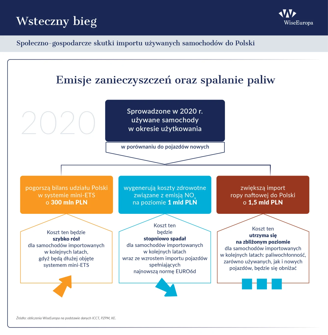 Poniższy schemat przedstawia podsumowanie kluczowych skutków importu emisyjnych, paliwochłonnych używanych pojazdów do Polski w 2020 roku: