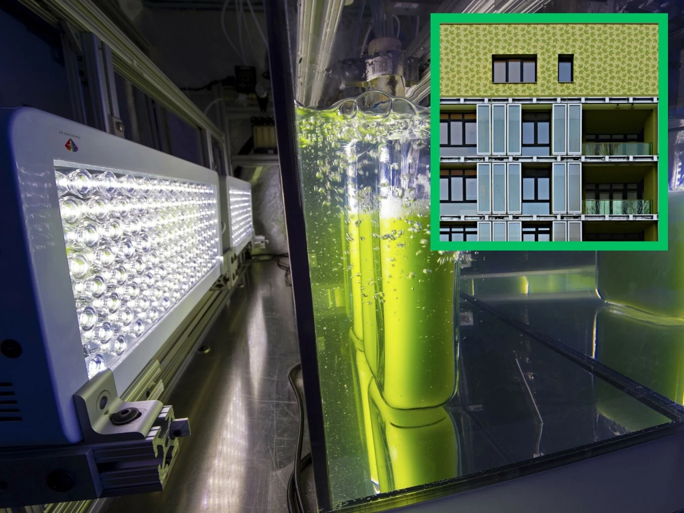 System oparty jest na funkcjonowaniu 129 bioreaktorów umieszczonych na fasadzie budynku. Z wyglądu przypominają one płaskie akwaria, wypełnione mieszaniną wody i jednokomórkowych glonów. Całość mieszaniny reaktywnej to, aż 3 500 litrów. Bioreaktory podłączone są pod system cyrkulacji gazowej, która dostarcza glonom dwutlenku węgla.