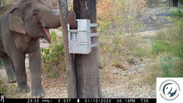 W badaniu przeprowadzonym w Salakpra Wildlife Sanctuary w Kanchanaburi w Tajlandii wykorzystano kamery aktywowane ruchem. Badacze obserwowali 77 dzikich słoni azjatyckich, które podchodziły do pudełek zawierających aromatyczne owoce. W zależności od wariantu zagadki, dostęp do owoców mogły uzyskać, pociągając za łańcuch, popychając drzwiczki do środka, lub przesuwając je w prawo. Słonie musiały samodzielnie odkryć, w jaki sposób można otworzyć przegródki.