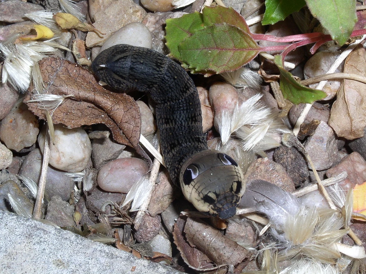 Na jednym końcu jej podobnego do trąby słonia ciała znajduje się zagięty kolec. Już on robi wrażenie, ale jeszcze mocniejszy jest drugi koniec ciała. Zaniepokojona gąsienica robi mały skręt głową, tak aby schować ją pod siebie, pod resztę ciała. Przednią część ciała jednocześnie nadyma tak, że nabiera ona nienaturalnej grubości i w ten sposób upodabnia się do wielkiej głowy. Na ciele larwy znajdują się plamy do złudzenia przypominające wielkie oczy. Na nadętym ciele nabierają dodatkowego wyrazu. Wydaje się jakbyśmy nie mieli przed sobą gąsienicy, ale... jakąś dziwaczną, pełzającą głowę. Jakiegoś przybysza z innej planety.