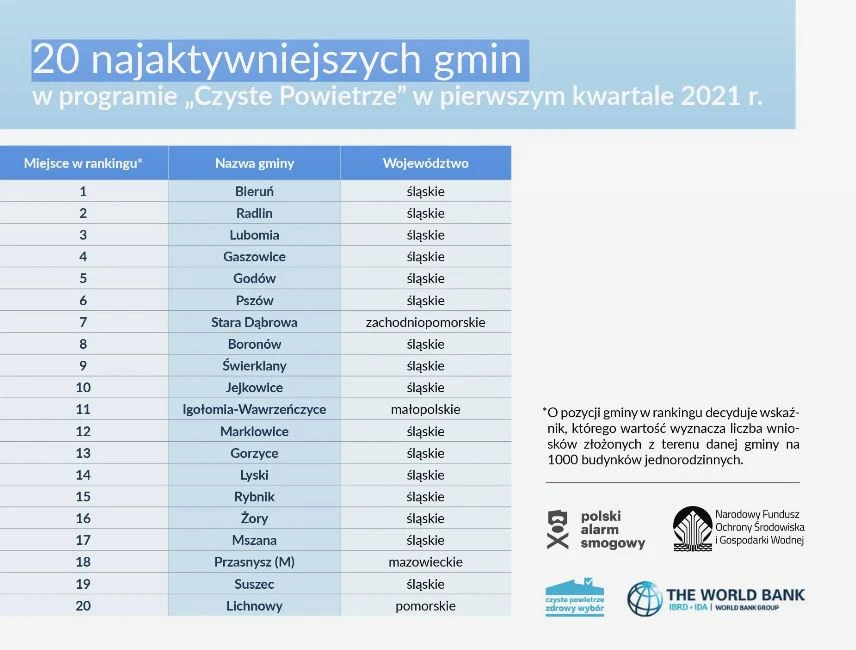 Wśród 20 najaktywniejszych gmin, aż 16 to gminy z województwa śląskiego. Jednak nawet w tym województwie ranking pokazuje duże zróżnicowanie, jeśli chodzi o aktywność w programie "Czyste Powietrze".