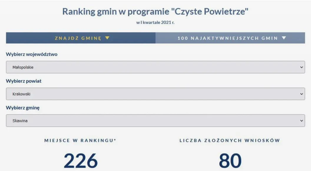 Ranking obejmuje aktywność gmin w programie "Czyste Powietrze" w pierwszym kwartale bieżącego roku (do dnia 31 marca). Ranking powstał przy współpracy NFOŚiGW, PAS i Banku Światowego. Jego celem jest motywowanie gmin do większej aktywności w zakresie zachęcania mieszkańców do wymiany kopciuchów. Jest to tym ważniejsze, że aktywność od 1 kwietnia bieżącego roku do 31 marca 2022 r. będzie premiowana przez NFOŚiGW.