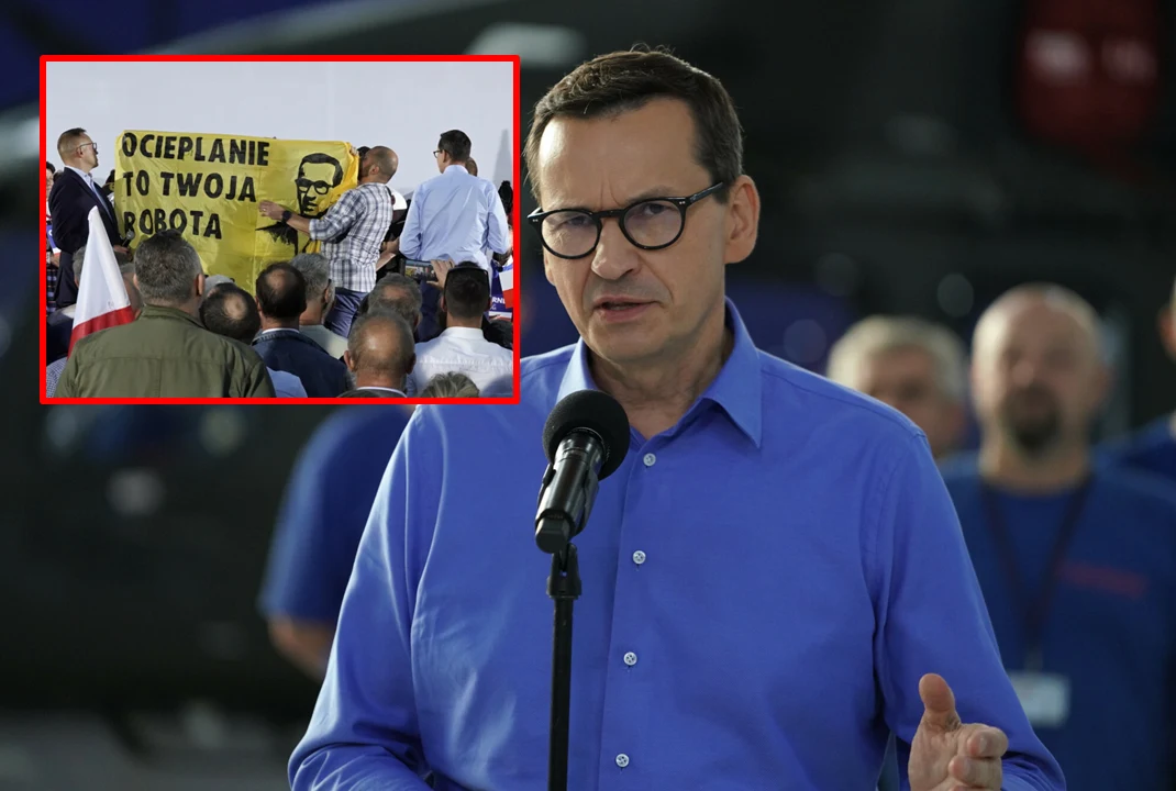 W czasie wiecu premier powiedział, że tuż przed spotkaniem "ktoś próbował go zaatakować". Chodzi o aktywistów z organizacji Extinction Rebellion Warszawa, którzy trzymali transparent z napisem "Ocieplenie to twoja robota". Mężczyźni zostali wyprowadzeni przez Służbę Ochrony Państwa i przekazani policji. "Niestety nasi przeciwnicy polityczni wybrali taką formę protestu, wybrali takie prowokacje. Widzimy to na coraz to kolejnych spotkaniach" - powiedział szef rządu i kontynuował spotkanie.