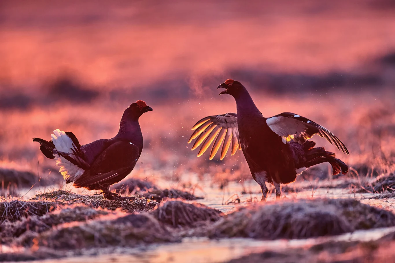 Próbują w ten sposób przestraszyć rywali, ale i zaimponować samicom. Kury zazwyczaj o wschodzie słońca przylatują na tokowiska, przyglądając się walczącym samcom. Ich przylot wywołuje u kogutów dużą ekscytację i przez obecność samic w czasie potyczek dochodzić może do wzajemnego wyrywania sobie piór. Po tym chaosie następują długie modulowane odgłosy - tzw. bełkotanie i czuszykanie.