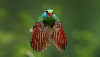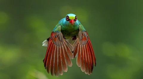 Przepiękny ptak o kolorach papug siada na gałęzi. Trudno uwierzyć, kim jest