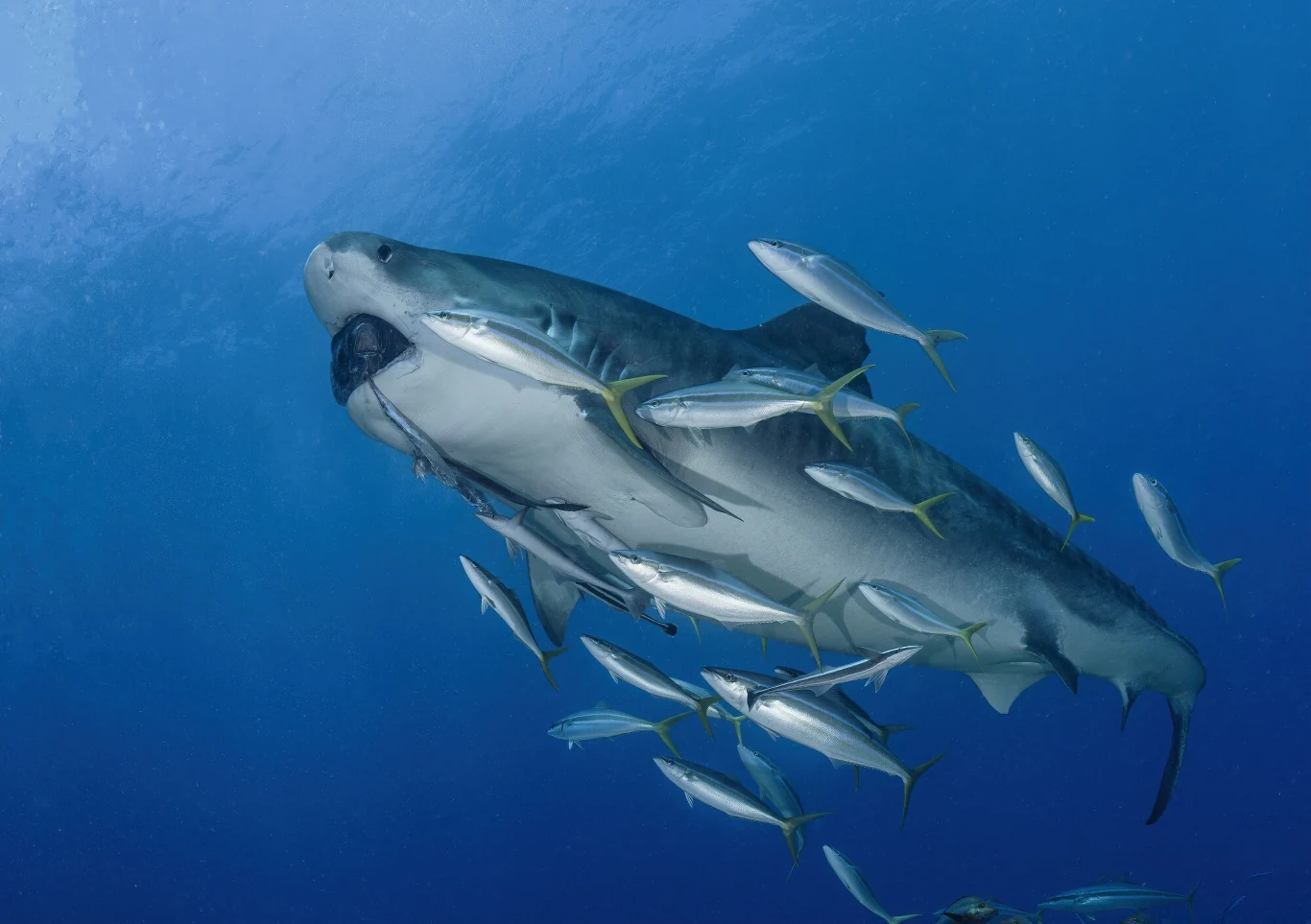 Żarłacze białopłetwe i żarłacze tygrysie sprawnie podzieliły się rolami. Większe rekiny rozrywały kawały mięsa, odrywały od reszty i zjadały część z nich. Reszta dryfowała swobodnie, stanowiąc posiłek dla znacznie mniejszych żarłaczy białopłetwych - te rekiny osiągają po dwa, dwa i pół metra. Rekordowe osobniki mierzyły niegdyś cztery. Natomiast żarłacze tygrysie są większe, mierzą nawet do pięciu metrów długości.