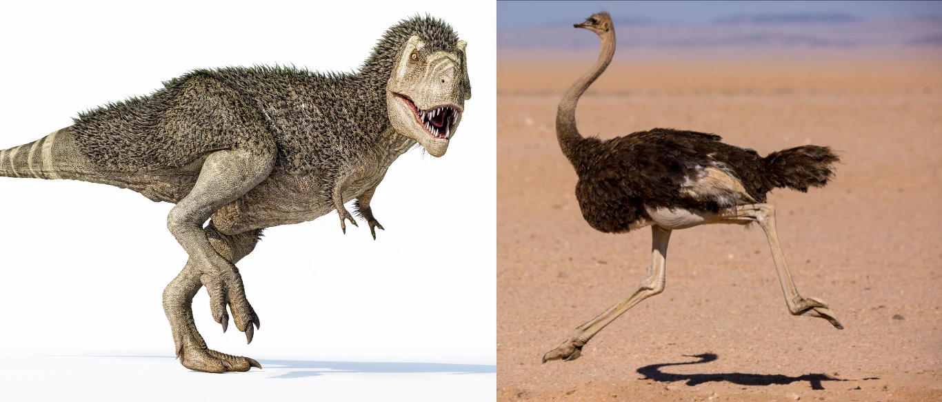 Dowody kopalne sugerują, że niektóre dinozaury miały podobną posturę do dużych biegających ptaków. Welociraptory i deinonychy miały stosunkowo cienkie ogony i długie, opierzone przednie kończyny, co przesuwało ich środek ciężkości do przodu i wymuszało bardziej pochyloną postawę, przypominającą postawę emu. "Wyjaśniając lokomocję dinozaurów osobom, które nie spędziły pół życia zastanawiając się nad takimi rzeczami lubię mówić, że najbardziej podobne do dinozaura teropoda byłoby emu z ogonem krokodyla" – dodaje van Bijlert.
